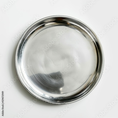 A shiny, circular metal tray with a smooth surface, used for serving food or drinks. isolated on white background