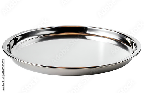A shiny, empty stainless steel serving tray with a reflective surface, isolated on a transparent background. high resolution PNG file