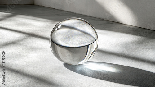 A shiny glass orb on a blank surface, reflecting distorted light, symbolizing perspective and chaos, with empty caption space on the side, inviting contemplation