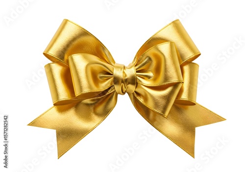 A shiny golden gift bow isolated on white background, closeup studio shot