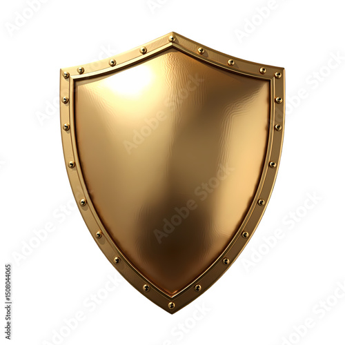 A shiny golden shield with a studded border on a black background in a studio shot rendering isolated on transprent background