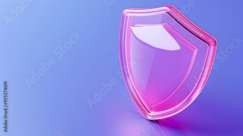 A shiny, pink translucent shield on a gradient blue background, symbolizing security, protection, and safety in a modern, digital context.