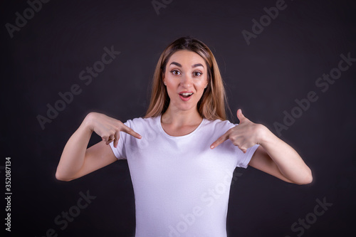 A shocked girl with an open mouth points her fingers at her t-shirt. The concept of advertising