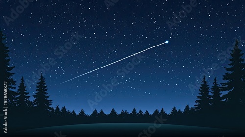 A shooting star glimmers brilliantly in a dark blue night sky, flanked by silhouettes of woods, creating a peaceful, serene atmosphere