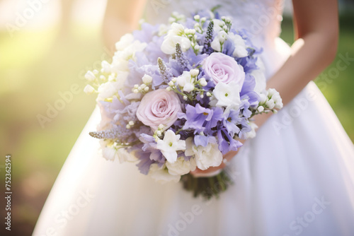 A shot capturing the bride's bouquet alongside her elegant periwinkle gown wedding, simple composition сreated with Generative Ai
