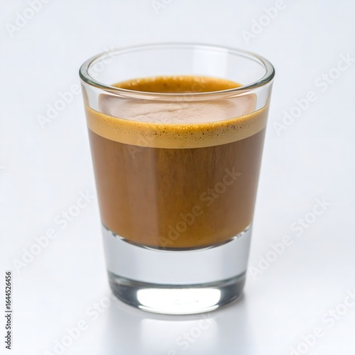 A shot of espresso in a clear glass, showcasing a rich crema.