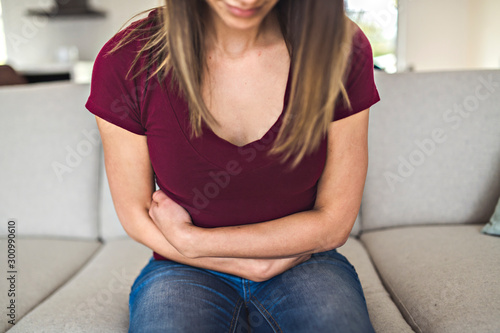 A Sick woman lying on sofa in the living room with stomach ache