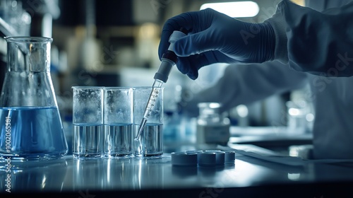 A side view of a doctor testing the pH of water samples as part of a laboratory quality control process.