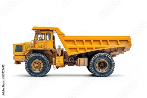A side view of a yellow dump truck, commonly used in construction and mining.