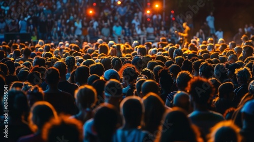A significant crowd of individuals gathering together and standing in front of a larger audience.