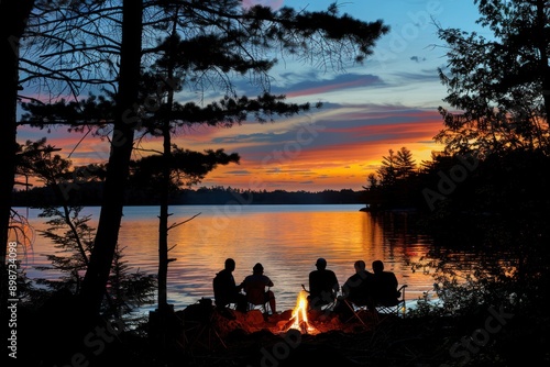 A silhouette group of friends gather around a campfire, camping in a forest near a lake