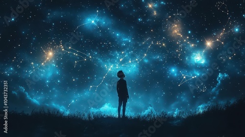 a silhouette of a black man stands on earth gazing up at a starry sky filled with constellations and zodiac signs evoking wonder and a connection to the universe