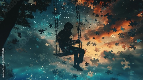 A silhouette of a child made of puzzle pieces swings under a vibrant twilight sky transitioning into night. Pieces float around the child, adding a magical and surreal atmosphere against the colorful