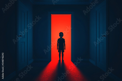 A silhouette of a child stands in a dim corridor, illuminated by a striking red light from an open door.