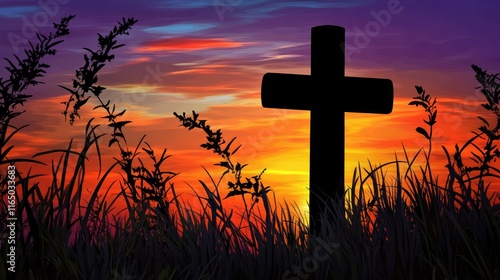 A silhouette of a cross against a vibrant sunset, framed by tall grasses swaying in the gentle breeze.