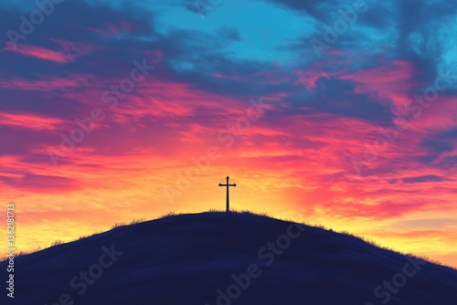 A silhouette of a cross stands atop a hill, framed by the vibrant hues of the sunset sky.