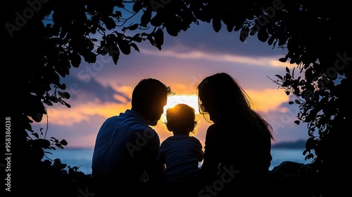 A silhouette of a family against a sunset, showcasing love and connection in a serene outdoor setting.