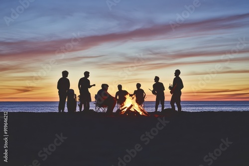 A silhouette of a group of people gathered around a bonfire on the beach, with a stunning sunset painting the sky in shades of blue, pink, and orange.