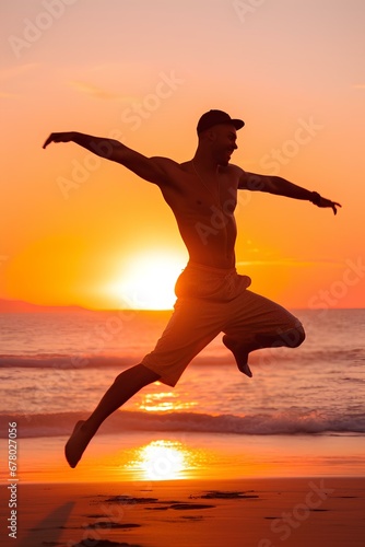 A silhouette of a man gracefully dancing on a sandy beach as the sun sets. generative AI
