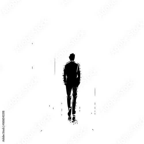 A silhouette of a man in a suit walking away into the distance on a white background in black and white