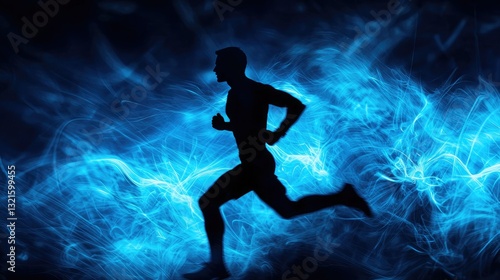 A silhouette of a man running, set against an abstract glowing blue background