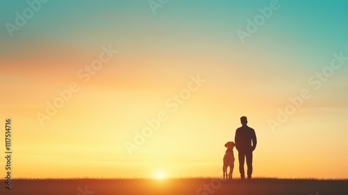 A silhouette of a person and a dog at sunset, standing together against a vibrant sky, symbolizing companionship and tranquility.