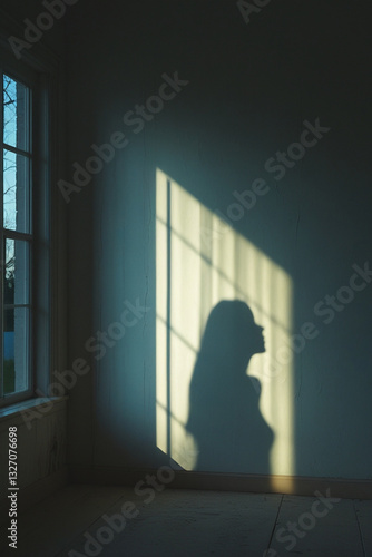 A silhouette of a person is cast on a wall by sunlight streaming through a gridded window in an otherwise empty room.