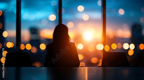 A silhouette of a person sitting by a large window, gazing at a vibrant sunset over a city skyline, evoking feelings of contemplation and inspiration amidst a busy lifestyle.