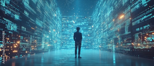 A silhouette of a person standing in front of a digital interface, representing technology, data, and innovation in a futuristic setting.