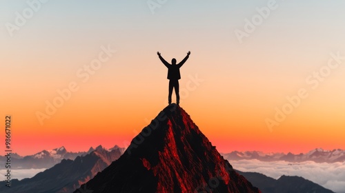 A silhouette of a person standing on a mountain peak with arms raised in victory backlit by a golden sunset The image conveys success achievement and triumph over challenges The background is expansiv