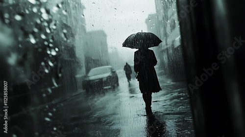 A silhouette of a person walking in the rain with an umbrella, creating a moody atmosphere.