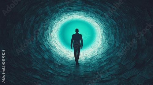 A silhouette of a person walks toward a glowing tunnel, symbolizing hope, transition, or a journey into the unknown.
