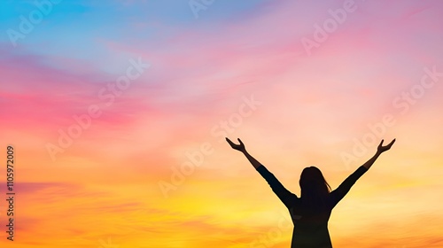 A silhouette of a person with arms raised against a vibrant sunset sky, symbolizing joy, freedom, and connection to nature.