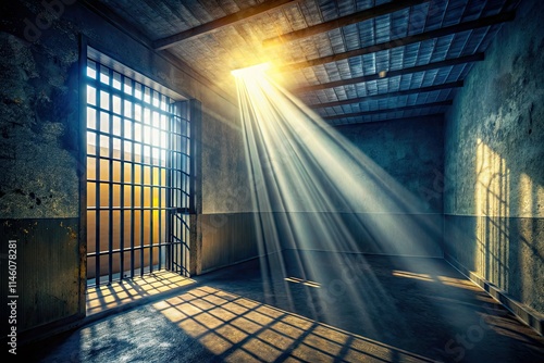 A silhouette of a prison cell, stark shadows highlight the bars, sun rays piercing the darkness.