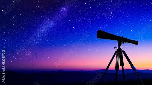 A silhouette of a telescope against a vibrant night sky filled with stars and mountains
