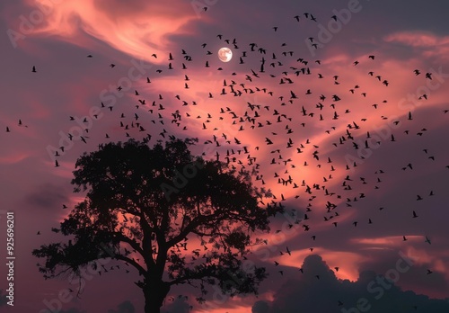 A silhouette of a tree with birds flying against a dramatic sunset sky, featuring vibrant pinks and purples.