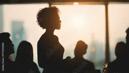A silhouette of a woman speaking, with sunlight streaming in through a window, while an audience listens attentively in the background.