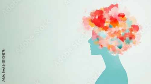 A silhouette of a woman with a colorful, abstract cloud of thoughts or ideas represented by vibrant splashes of color.
