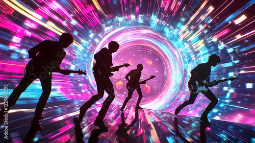 A silhouette of an energetic rock band playing on stage, surrounded by colorful lights and a cheering crowd in the background. The scene captures the excitement and energy of live music, with