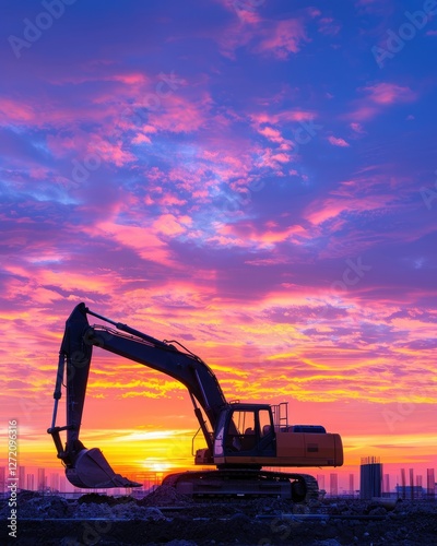 A silhouette of an excavator against a vibrant sunset, with colorful clouds illuminating the sky, highlighting construction and nature's beauty.
