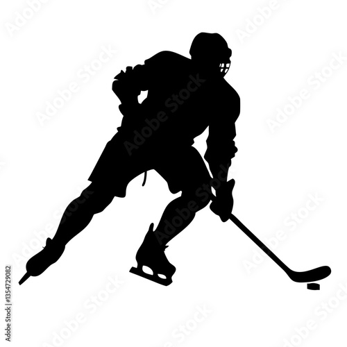 a silhouette of an ice hockey player in action, skating and handling the puck with speed and skill. The player is wearing a helmet and protective gear, focused on the game