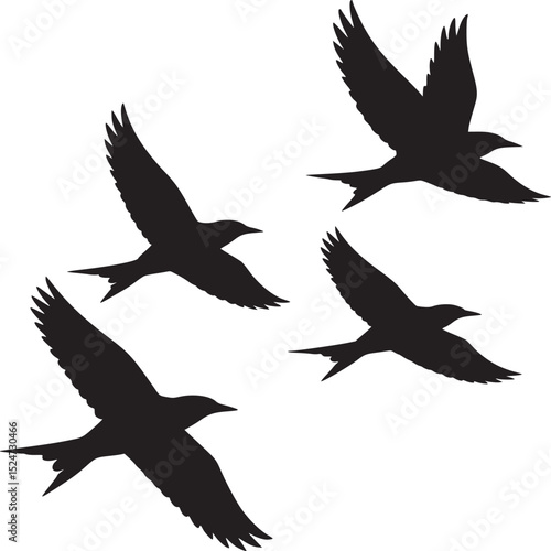 A silhouette of four birds flying in formation against a white background in a minimalist style art