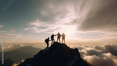 A silhouette of four men or hikers helping one another climb up to the top or peak of a mountain successfully, showcasing the power of teamwork and collaboration in achieving success.