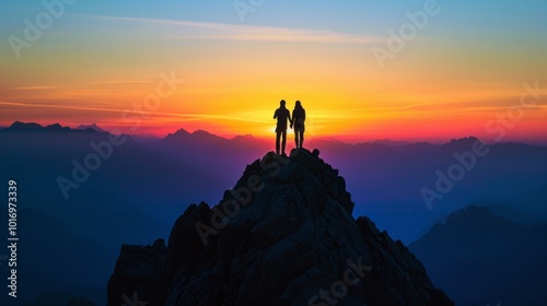 A silhouette of two friends standing on a mountaintop, arms linked, against the backdrop of a radiant sunset. The image signifies the unbreakable bond forged through shared adventures and the beauty