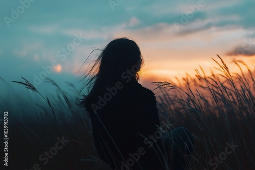 A silhouette reflects thoughtfully in a field of grass, under a stunning sunset sky with vibrant colors.