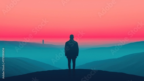 A silhouette stands on a hill, gazing at a vibrant sunset that blends pink and blue hues over rolling hills.