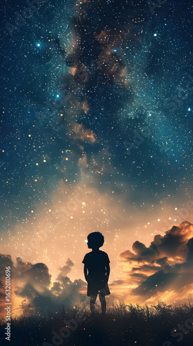 A silhouetted child stands on a grassy hill, gazing upwards at a vibrant, starry night sky. The image includes clouds and an orange and blue gradient.