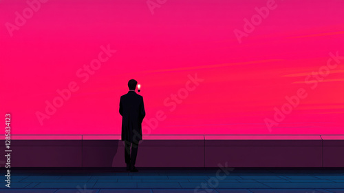 A silhouetted figure gazes at a vibrant pink sunset, evoking a sense of contemplation and solitude.
