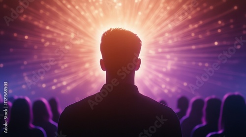 A silhouetted figure stands before a vibrant, luminous backdrop, creating an atmosphere of wonder and inspiration amidst a crowd.