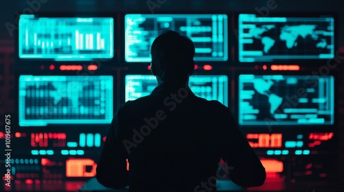 A silhouetted figure stands before multiple glowing screens displaying data and maps, suggesting a high-tech, analytical environment.